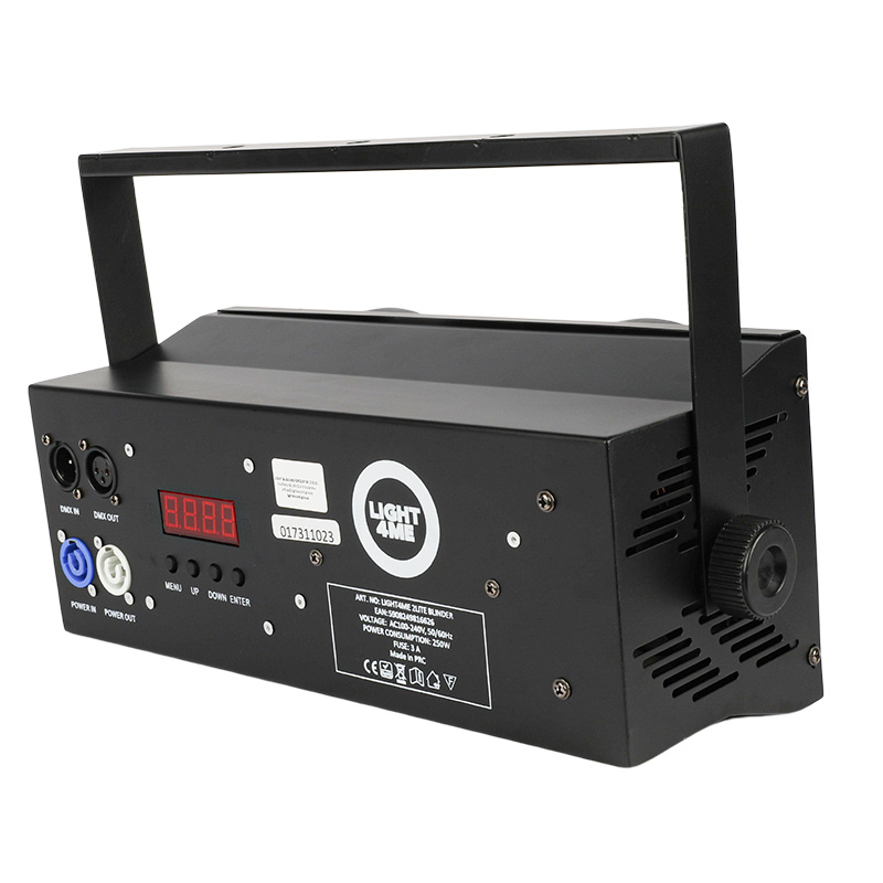 Light4Me 2Lite Blinder can be easily installed on trusses or lighting ramps using the mounting bracket included with the device. Such mounting allows you to achieve the desired beam angle and, as a result, illuminate the required area. On the back of the blinder there are powercon sockets, including a special ✅ “power linking” type output, allowing direct power transfer between devices. In addition, there are also 3-pin XLR sockets, allowing the device to be operated using DMX protocol. The control panel consists of a digital display and four buttons, guaranteeing easy setup and operation. Using it, we can ✅ select one of four operation modes: